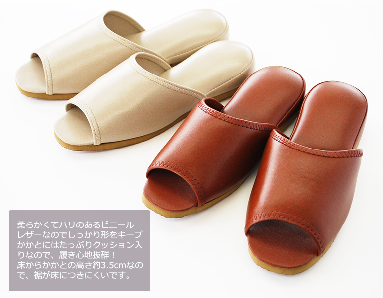 甲裏もビニールレザーのお手入れ簡単アニリンレザースリッパです♪底が厚めのしっかりしたEVA素材なので色々な床材に順応します。かかとには厚めのクッション入りなので履き心地も抜群!底材と中敷きが厚めなのでパンツの裾が地面に着きにくいです。つま先と足入れ口にはステッチ入りなので伸びを多少軽減します。