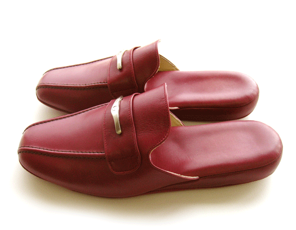 上質を追求した室内履きファーストクラス。表地には本牛革を使用し長めのパンツを履いてかかとを隠すと靴を履いている様に見えるユーモアのあるスリッパです。中敷きかかとには堅めの弾力あるかかとが落ちない形のクッション入りです。甲の裏には馬革、底にはナイロンスエードを使用し、パタパタ音が鳴りにくい静音設計です。