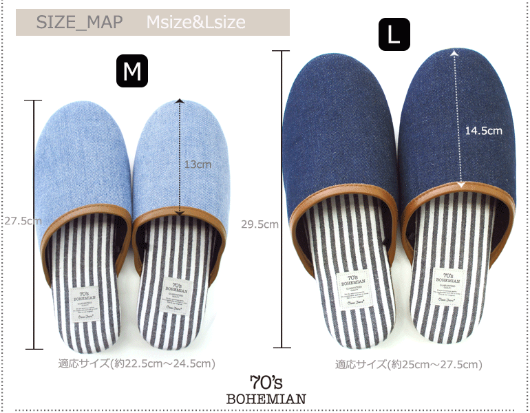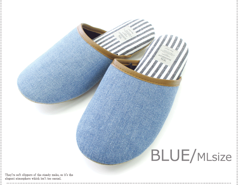 独特な風合いのあるデニム生地をしっかりとした造りのソフトスリッパに。 中敷爽やかなストライプとの相性抜群! カジュアルになりすぎない様パイピンがアクセントに。 底にはパタパタ音が鳴りにくいポリエステルスエード生地を使用。 MサイズLサイズと2サイズなので、カップルやファミリー使いに重宝します。
