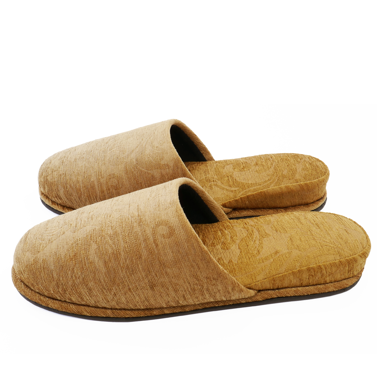 玄関が華やかになるリーフ柄のシェニールスリッパです。 重厚感のあるシェニールにリーフの型押し柄がとても上品です。 落ち着いた色合いも更に雰囲気が出ます。 大切なお客様のおもてなしに最適スリッパ。 底は汚れたらサッと拭けるPVCレザーなのでお手入れ簡単です。