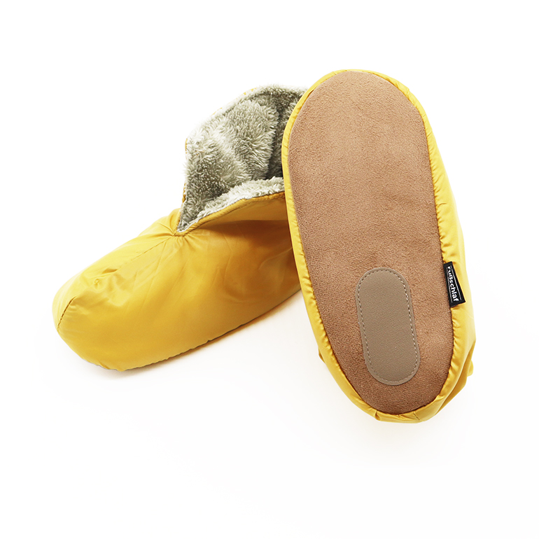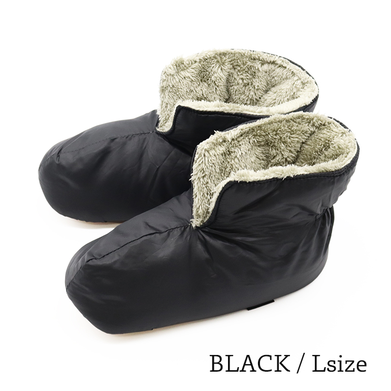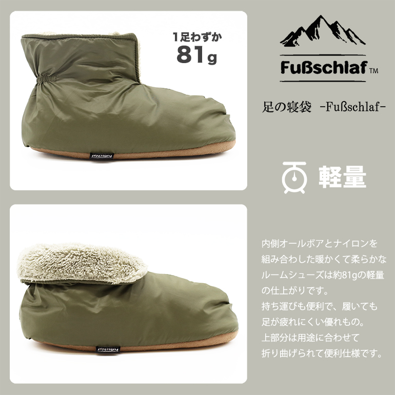床からの冷えを温めてくれる足の寝袋。 くるぶしまで覆うブーツタイプと内側には暖かいボア仕様ですので、寒い冬も乗り切れそう。 すっぽり覆われて暖かさはもちろんのこと、かかと部分には伸縮性のギャザーが施されていますので、歩行時も脱げにくく快適に着用できます。 内側オールボアとナイロンを組み合わした暖かくて柔らかなルームシューズは片足約81gの軽量の仕上がりです。 持ち運びも便利で、履いても足が疲れにくい優れもの。 上部分は用途に合わせて折り曲げられて便利仕様です。