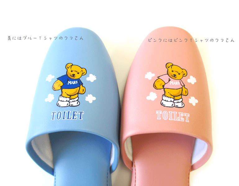 10年以上量販店で販売されている、ザ・トイレスリッパクマトイレの登場です! お手入れが気になるトイレスリッパですが、クマトイレはビニールレザーなので、 汚れたらサッとひと拭き!底にも同じ素材なので同じくひと拭き! 甲にはなんとも愛くるしいクマのプリント。 “TOILET”とプリントしているので専用にお使い頂けます。