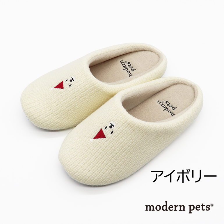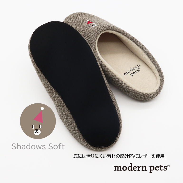 modernpets(モダンペット) スリッパシャドウズチャールス モダンペットの人気キャラクター「ドリーミングベアドッグ」のワンポイント刺繍のルームシューズ。柔らかいニット生地にこっそり隠れるドリーミングベアドッグが大人可愛い雰囲気に。足をすっぽり包み込んでくれるので、つま先まであったか。 底面には滑りにくい素材を使用しているので安心です。