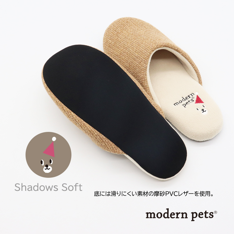 modernpets(モダンペット) スリッパシャドウズチャールス モダンペットの人気キャラクター「ドリーミングベアドッグ」のワンポイント刺繍のルームシューズ。柔らかいニット生地にこっそり隠れるドリーミングベアドッグが大人可愛い雰囲気に。手を使わないでもスッと履けて軽量なので普段使いにも便利でギフトにもおススメです。底面には滑りにくい素材を使用しているので安心です。
