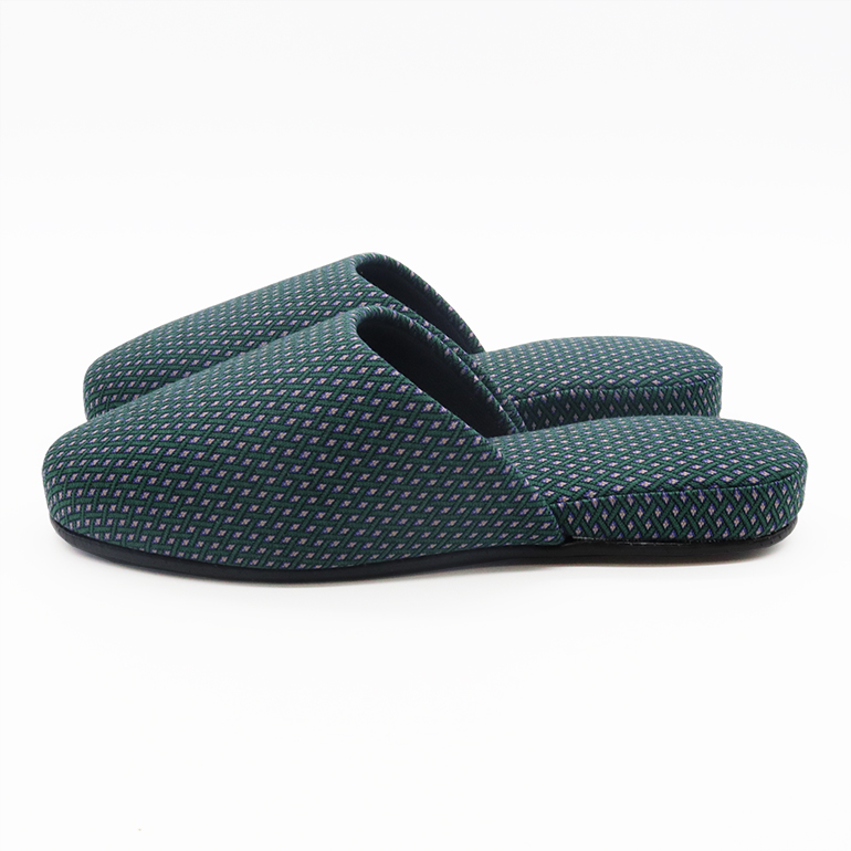 【七匠 ×OKUMURA 「粋ないなせ」collection】 翼を広げた鶴を菱形に模した文様の「菱文様」を使った和柄スリッパです。レトロな雰囲気なスリッパに仕上がってます。底面には消音効果のある素材を使用し歩行時のパタパタ音を軽減します。