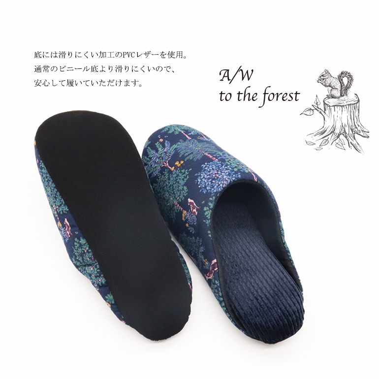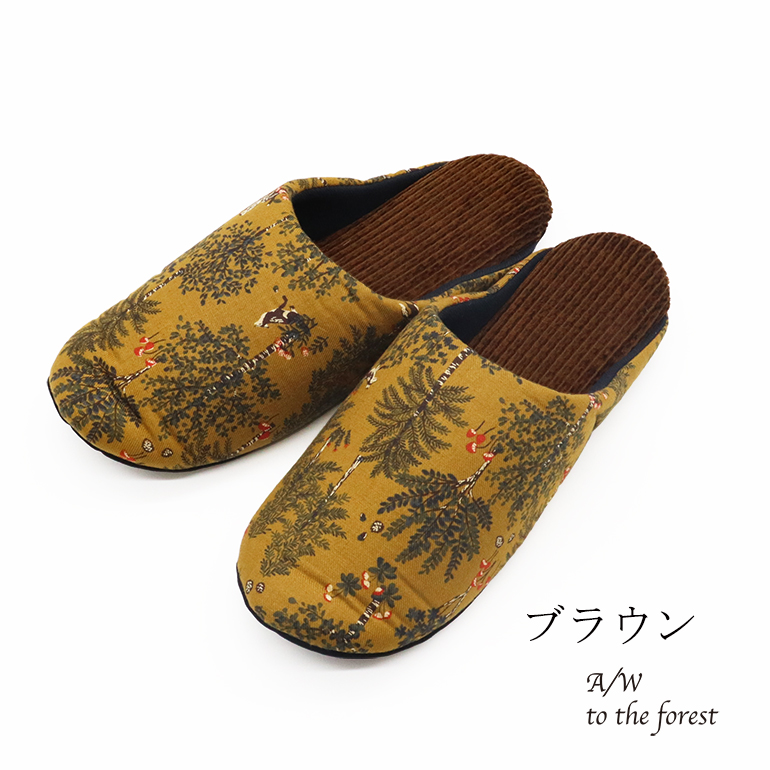to the forest  フォレスト 森の中にふくろうやオオカミの日常を描いた落ち着いたプリント柄のソフトスリッパです。