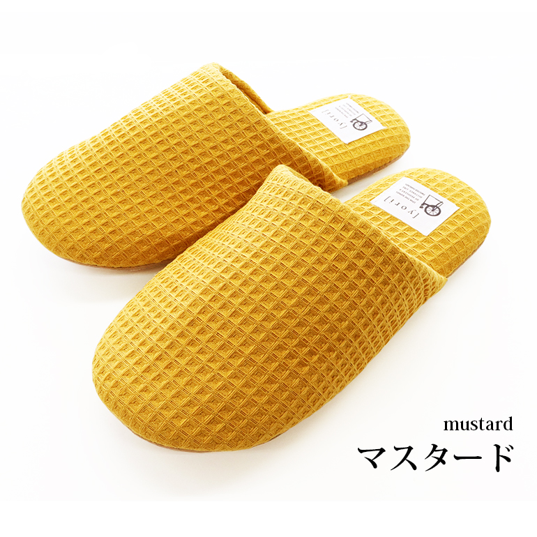 綿100%のコットンワッフル素材のスリッパです。中敷き甲裏もコットンなので、素足に履いて心地いい。